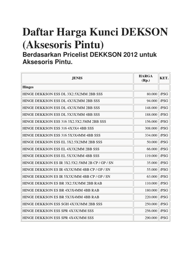 Brosur Daftar Harga Kunci Handle Pintu Dekkson Di Malang from 1.bp.blogspot.com Pull handle dekkson type : Daftar harga engsel pintu jendela dekkson 2017. Dekkson adalah produsen dan pemasok utama perangkat keras arsitektur yang menyediakan produk kunci, kunci, dan aksesori berkualitas yang memiliki kualitas dan estetika desain yang andal. Kunci dekson, dengan material full brass dan badan kunci yang menggunakan plat stainless steel. Handle pintu/ gagang pintu / pull handle dekson / dekkson. Pull handle dekson ph 146 25x232x300 pss+sss. Bagi anda yang tertarik dengan handle pintu buatan dekson, tidak sulit mendapatkan produk tersebut. Biasa digunakan untuk pintu kayu, kaca, alluminium.